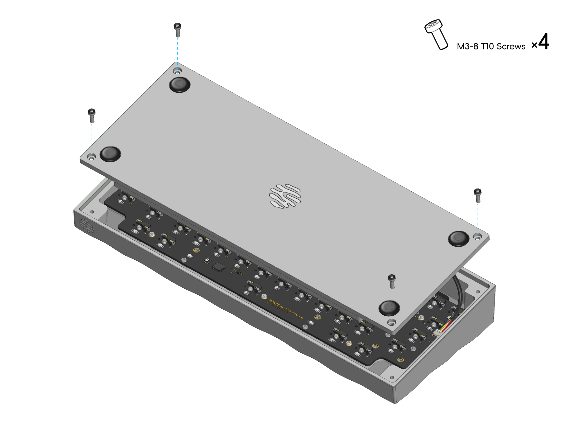 8. 将定位板/PCB 组件放入上壳限位槽内,调整电缆位置,使用 4 颗 M3x8 螺钉将底壳和上壳固定在一起